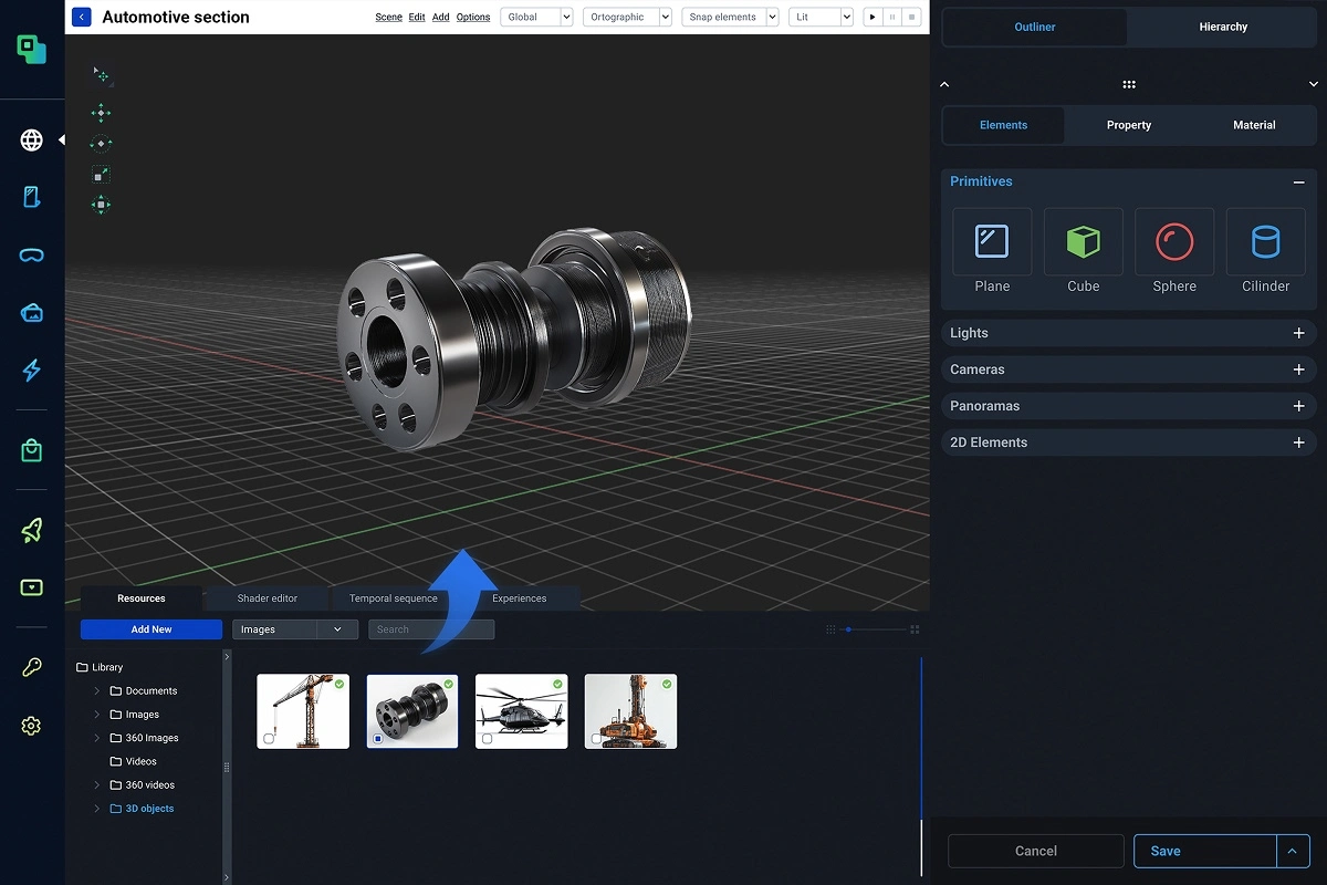 Bring your environments to life with dynamic 2D elements and interactive hotspots. Effortlessly add text, images, audio, and video, or craft navigation points and action triggers with a simple drag and drop.